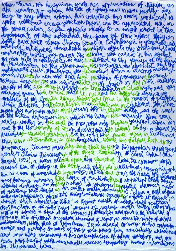 To the honour of the father of logarithms - John Napier. It's written with my left hand in English about his life. Tha text is taken from a book about math-history. Napier's first book about logarithms was published in 1614. |