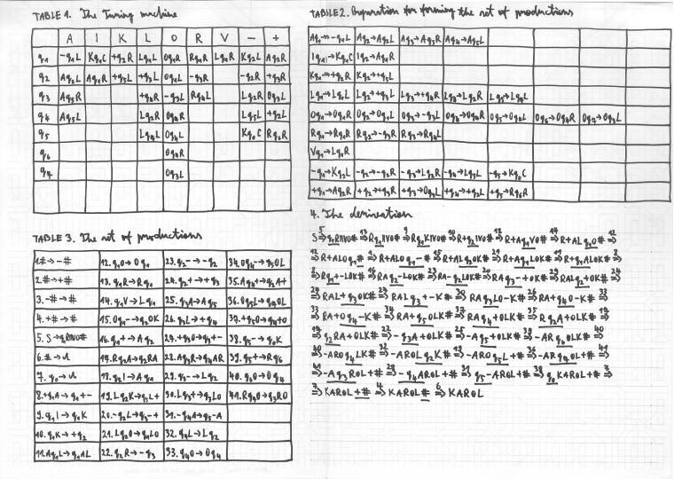 Inspiration for this picture I got from university where I studied "Automata and formal languages". Here is the Turing machine, then the set of productions and finally the derivation. Although the derivation does not have any mathematical sense I made it just like that for illustrating the process of derivation. Karol is my roommate in hostel. By clicking the picture a larger version can be seen. |