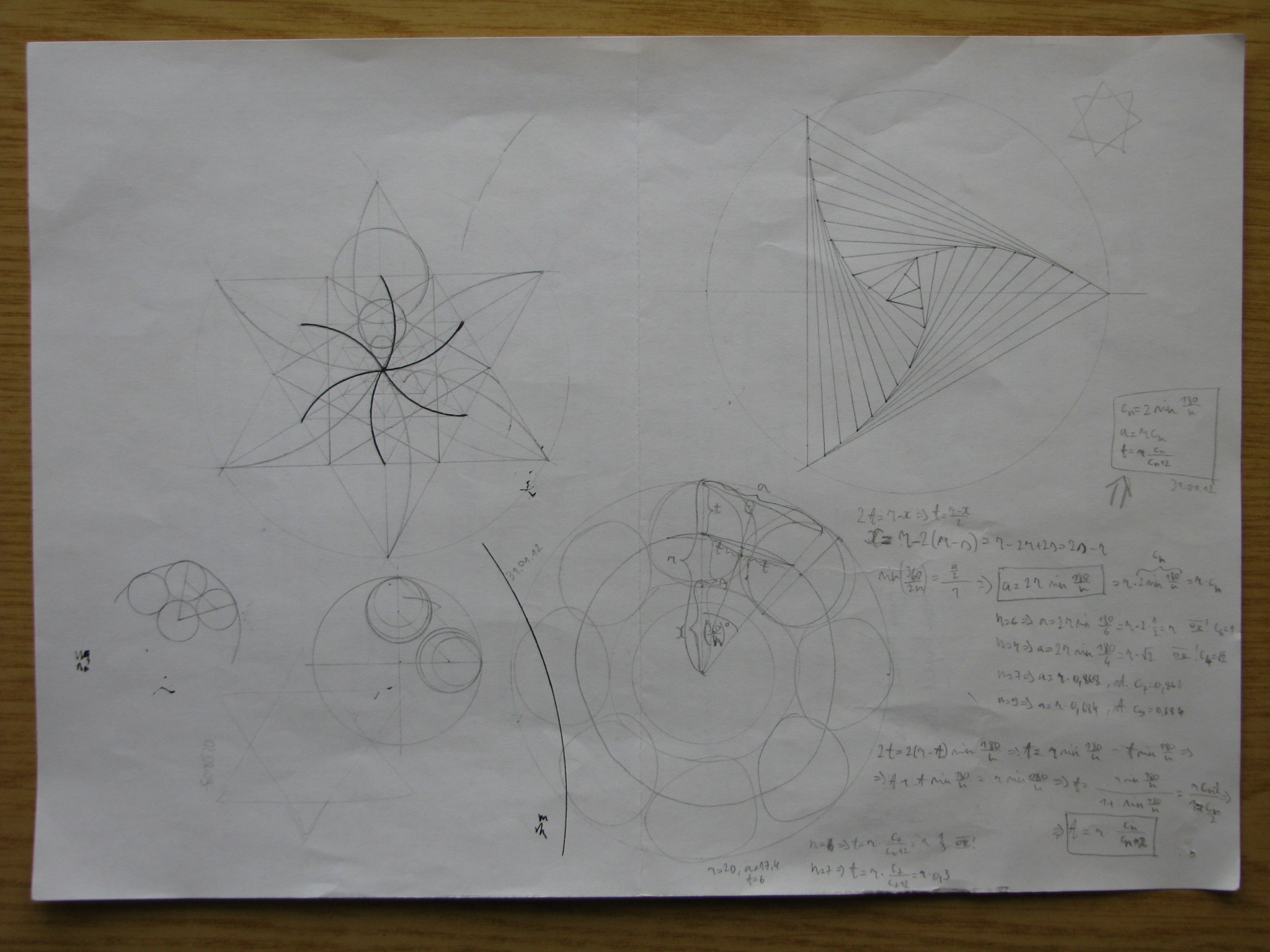 Kuna tahtsin teha korrapärast 7-nurka, siis selle tegemiseks vajasin teatud tabelit, mille kaudu olen varem hulknurki joonistanud. Tabeli põhimõte oli selles, et igale n-le vastas kindel kordaja, ja kui selle kordajaga korrutada läbi ringjoone raadius, siis saab vastava n-nurga küljepikkuse, mida on juba üsna kerge joonlauaga ringjoone sisse kanda ning lõpuks hulknurk kätte saada. Seda tabelit kasutasin viimati ammu ja ei olnud meeles, kus ta mul on. Korraga aga mõtlesin, et arvutaks ise välja, kuidas need kordajad saada vastavalt suvalisele n-le. Ja see õnnestuski, käiku läks vaid 9. klassi geomeetria! Siis aga tekkis järgmine küsimus: kui ma tahan suure ringjoone sisse joonistada n väikest ringjoont, siis lähtudes suure ringjoone raadiusest, kuidas arvutada väikese ringjoone raadius? Täiendasin joonist ja ka see valem sai leitud, kusjuures matemaatika ei väljunud 9. klassi raamest. Hämmastav, kui lihtsad ja ilusad need valemid tulid! Seetõttu olgu nad ka siin kättesaadavad, vt. sketipaberi alumist paremat nurka. Niisiis, cn=2sin(180/n), a=rcn , t=rcn/(cn+2). Kui seda tead, võid joonistada midagi sarnast! Pildil klikkides näete suuremat versiooni.