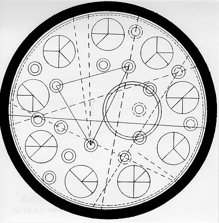 In home we have a clock, over ten years old and made in USSR. It is amazingly precise, but the picture is very childish, just like meant for children. So I made new picture and here it is. The clock also has a form like a round pentagon (just like a flower with five flower-leafs) and I drew something for them also: the result is here. Oh, the idea for 9 circles (not 12!; and the idea for the inner look for these circles, not the idea of number of circles) I took from Aphex Twin's album "Selected ambient works vol. II" and all the other is made by watching Orb's album's Orblivion cover. |