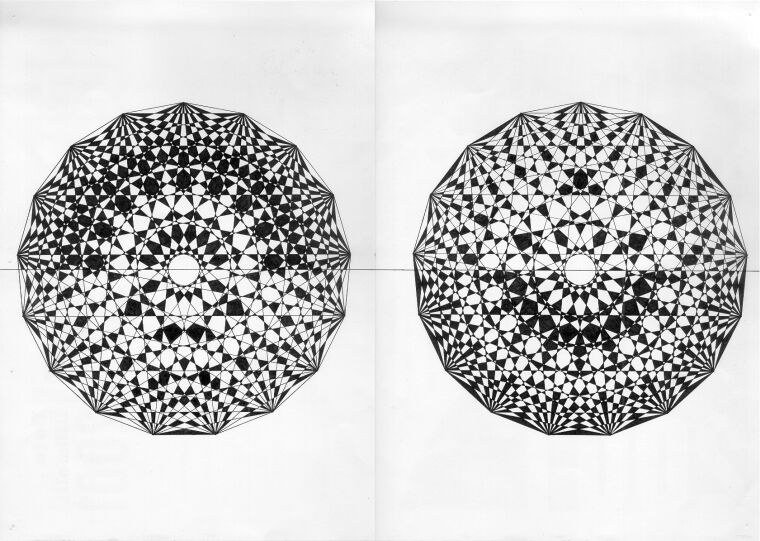 The first visible algorithm is simple. The second one, non-dual to the first, probably takes some time to understand. Once again this A3 picture didn't suit to the scanner and I had to scan twice and then join the two pictures. The big version of this picture is by clicking the picture (426 KB). |
